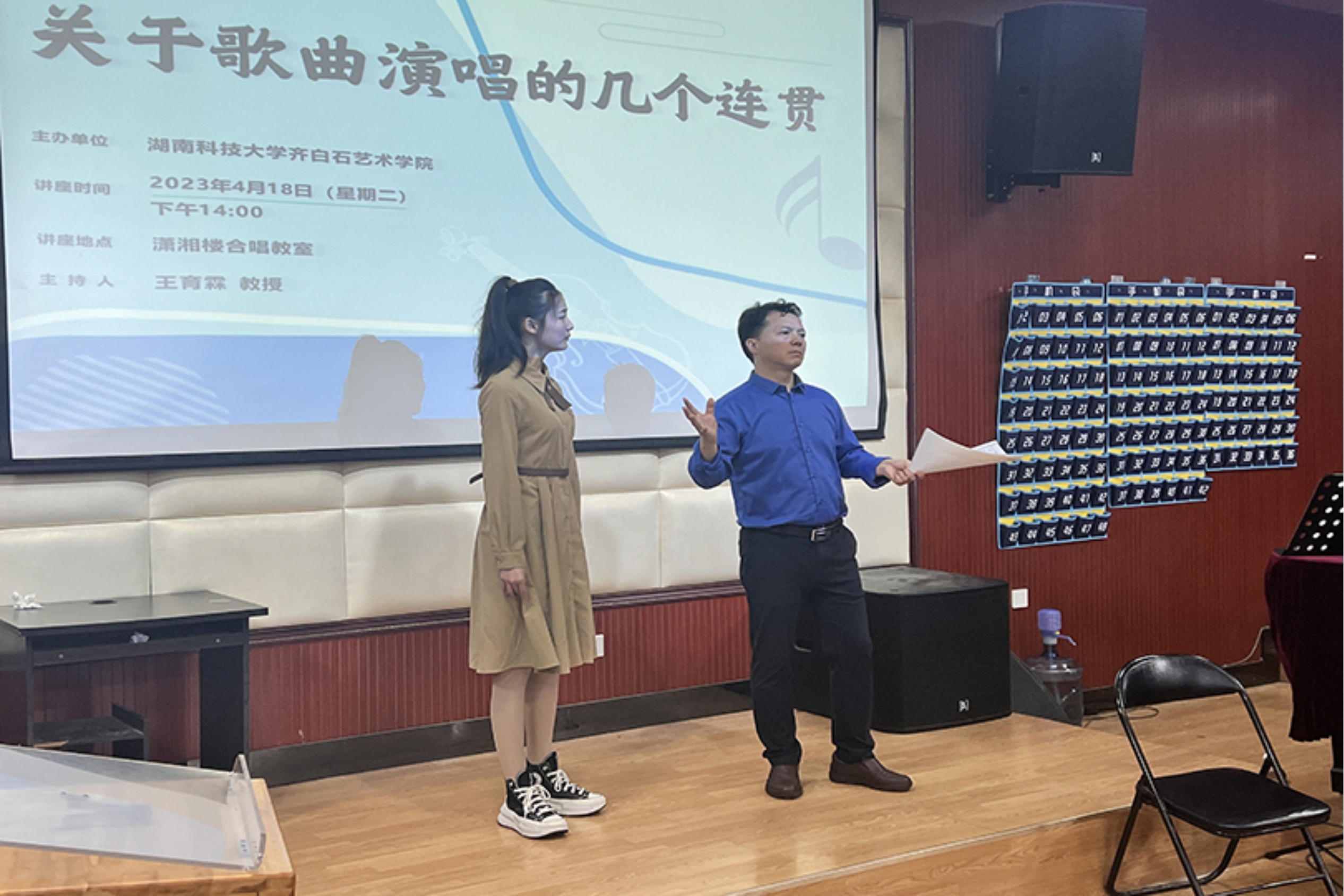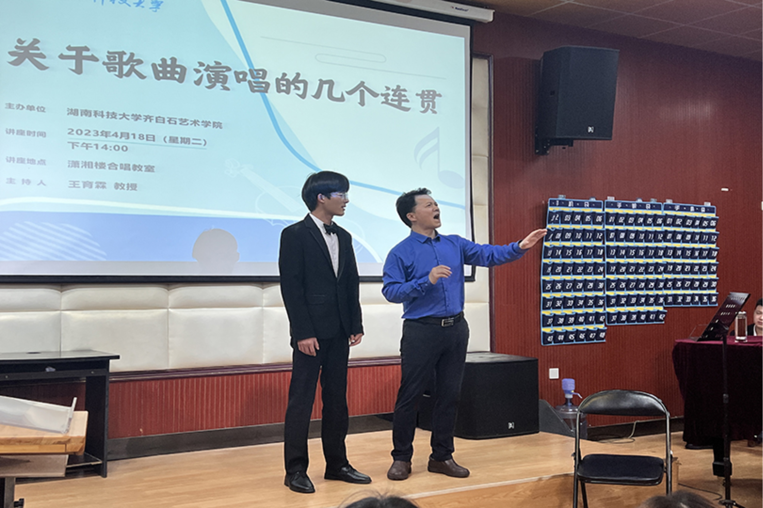 为进一步提升a片网 音乐系声乐教学质量,提高学生声乐演唱水平,4月18日下午,a片网 特别邀请到了马关辉教授在音乐系合唱教室开展主题为《关于歌曲演唱的几个连贯》的专题讲座,由a片网 副院长王育霖教授主持本次讲座。讲座以声乐公开课的形式开展,音乐系师生与会参加。