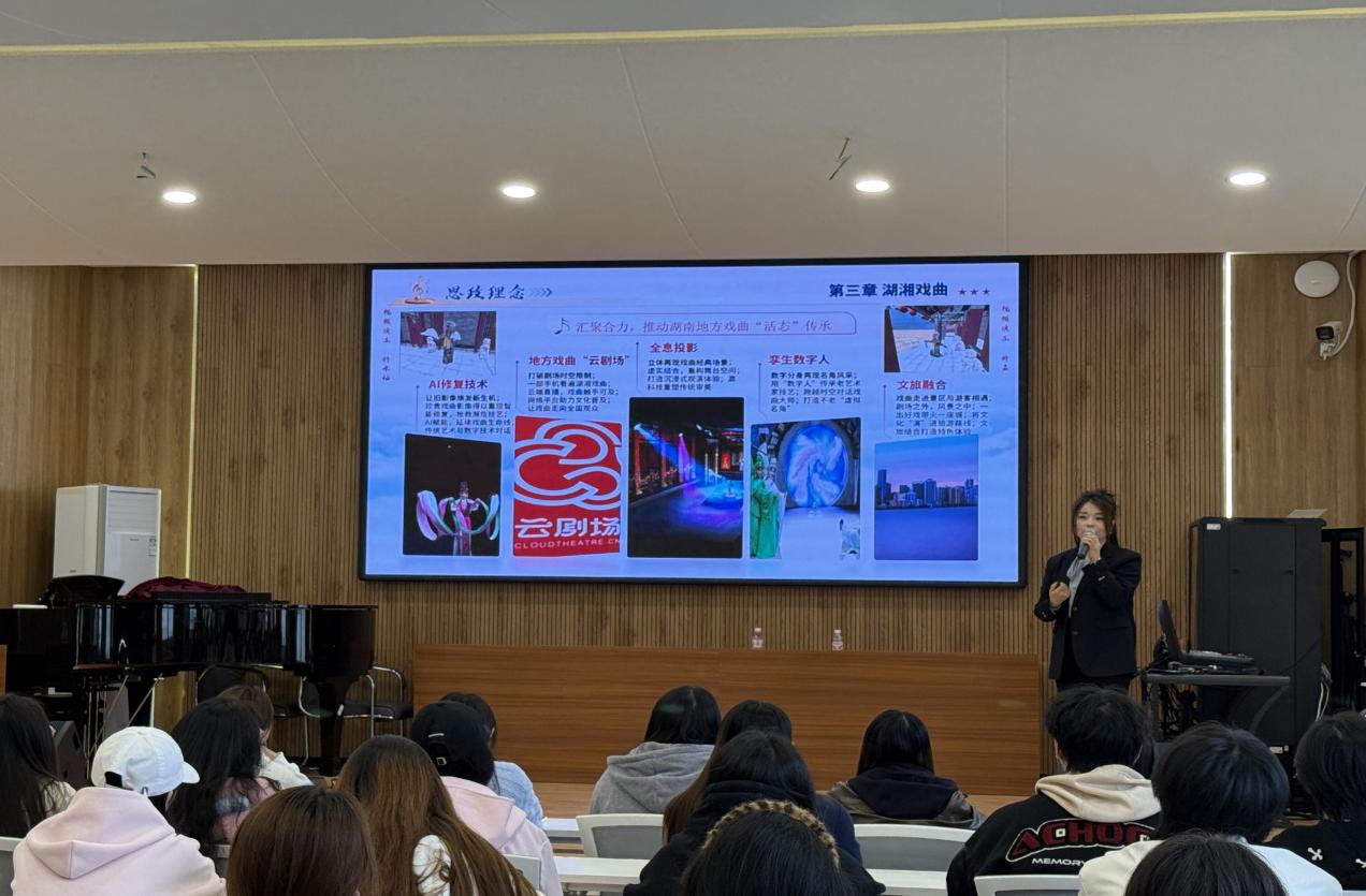 课堂以红色经典声乐作品《半条红军被》为教学重点,结合革命历史背景,运用AI数字化教学手段辅助演唱示范与音频解析。通过作品精讲、现场示范演唱、红色故事宣讲,让学生在学唱歌曲的同时感悟红色精神,深刻理解湖湘文化与红色文化交融共生的深厚底蕴。