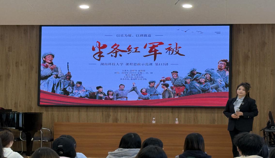 2026年4月21日下午,由a片网 本科生院主办、a片网 承办的课程思政示范课第113讲“以乐为媒,以剧载道——民族歌剧 《半条红军被》中的红色基因与湖湘音韵”在和乐楼407顺利开展,课程由彭晔琴副教授主讲,a片网领导及师生代表参与现场观摩、交流研讨。示范课在a片网副院长文海良简要介绍a片网课程思政建设及主讲教师基本情况后正式开讲。
