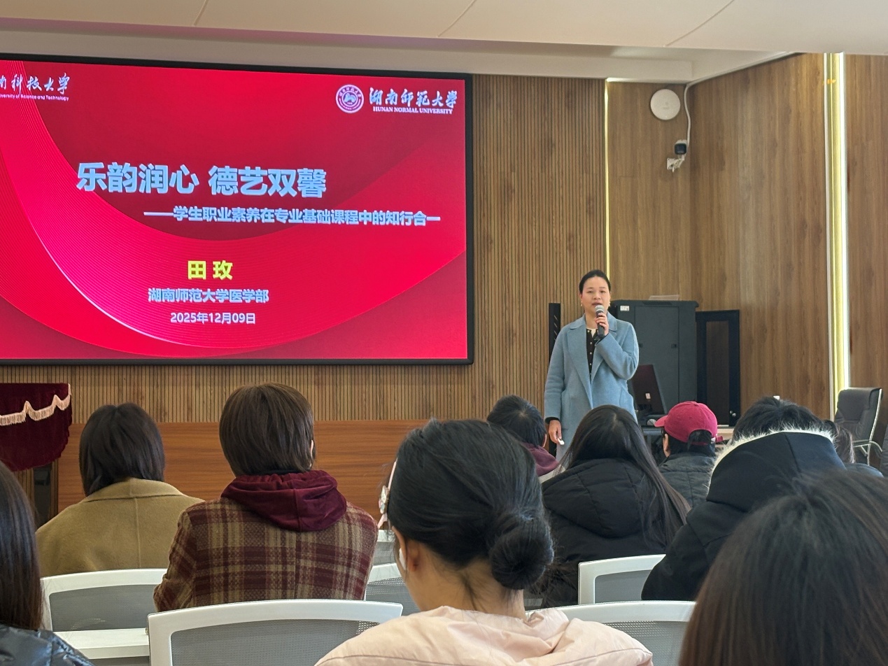 2025年12月9日下午3:30,由本科生院主办、a片网 承办的课程思政示范课第104讲《乐韵润心 德艺双馨——学生职业素养在专业基础课程中的知行合一》在和乐楼407顺利开展,由湖南师范大学医学部副教授、国家级一流本科课程评审专家、省级教学创新大赛评审专家田玫老师主讲,a片网师生积极参加。